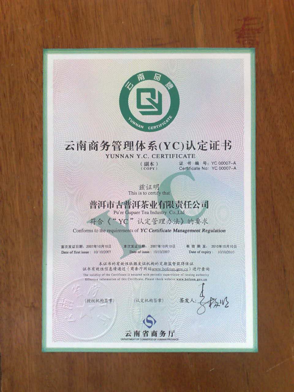 公司成立至今,在普洱、西雙版納、臨滄三大茶區(qū)中擁有生態(tài)茶園6000多畝,古樹(shù)大葉種茶3000多棵。為完善公司管理需要,2006年12月通過(guò)茶葉食品生產(chǎn)許可證A級(jí)認(rèn)證;2007年10月首次取得云南品牌YC認(rèn)證;2008年4月通過(guò)出口食品衛(wèi)生注冊(cè)認(rèn)證;2010年獲得云南省著名商標(biāo);多年來(lái)公司產(chǎn)品榮獲許多榮譽(yù)和多項(xiàng)資格認(rèn)證,其中最引人注目的是,公司生產(chǎn)的宮延普洱茶榮獲“2002年廣州茶博覽交易會(huì)”暨第二屆(秋季)優(yōu)質(zhì)茶評(píng)比大賽的“普洱茶王”稱號(hào),并以100克16萬(wàn)的天價(jià)拍賣(mài)成交。創(chuàng)造了中國(guó)普洱茶歷史上的第一個(gè)“茶王”稱號(hào)。同時(shí)也給云南省各族人民帶來(lái)了一張響亮了名片。